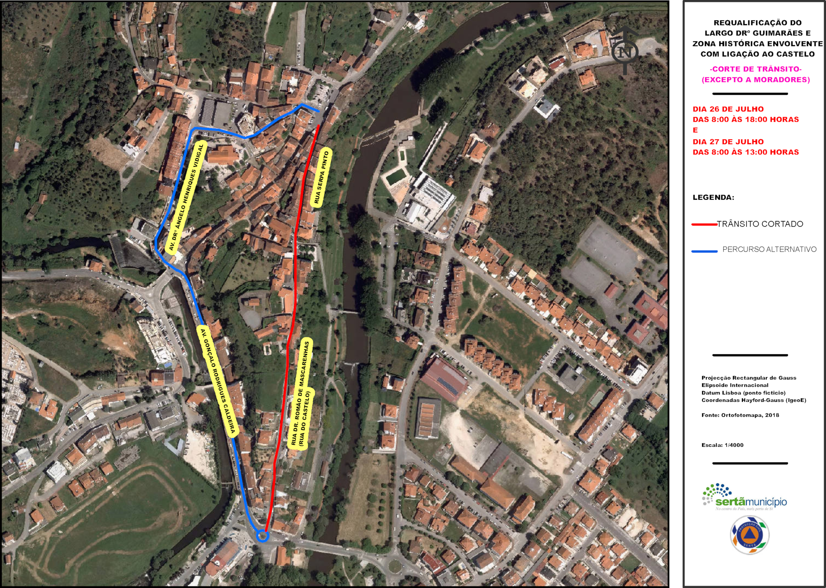 No dia 26 de Julho, entre as 8 e as 18 horas e dia 27 de Julho das 8 horas às 13 horas, o trânsito estará cortado à circulação automóvel na Rua Drº Romão de Mascarenhas e Rua Serpa Pinto na Vila da Sertã (Rua do Castelo), excepto os moradores, por motivo de obras relacionados com colocação de contentores de resíduos urbanos no âmbito da execução de trabalhos do Largo Dr. Guimarães.