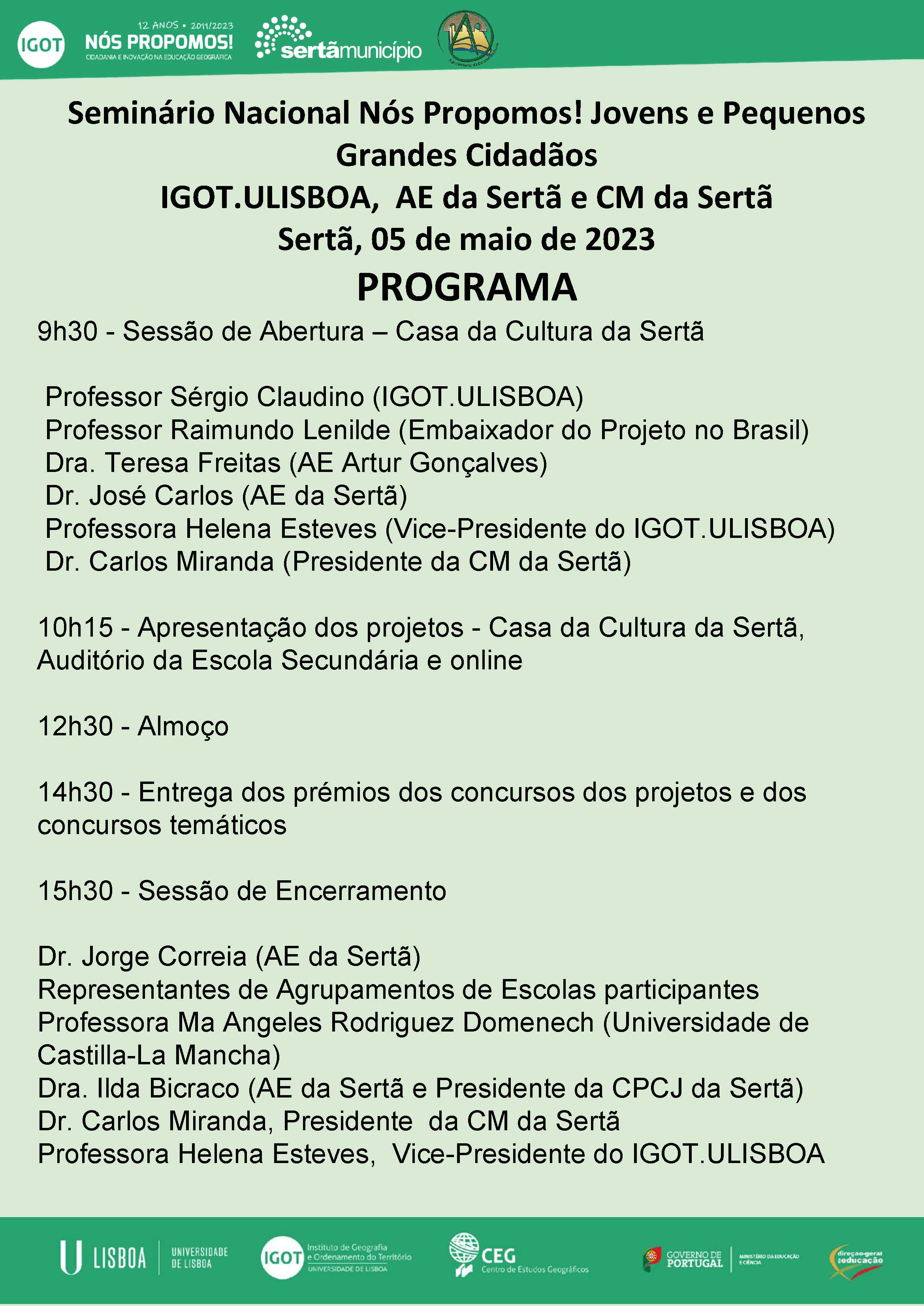 A sessão de abertura realiza-se às 9h30m e contará com os discursos de Carlos Miranda, presidente da Câmara Municipal da Sertã, Helena Esteves, vice-presidente do IGOT Lisboa, Sérgio Claudino, docente do IGOT Lisboa, Raimundo Lenilde, Embaixador do projeto no Brasil, José Carlos Fernandes, director do Agrupamento de Escolas da Sertã e Teresa Freitas, Agrupamento de Escolas Artur Gonçalves (Torres Novas). Durante a manhã, das 9h30 às 12h30, serão apresentados todos os projetos e, à tarde, serão atribuídos todos os prémios nacionais associados ao Projeto Nós Propomos! Pequenos Grandes Cidadãos e Jovens Cidadãos, nas categorias: Melhor Projeto, Site, Vídeo, Spot, Texto, Fotografia, Desenho e Canção.